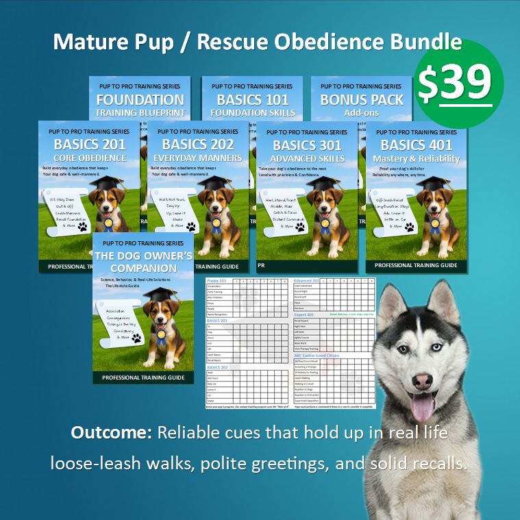 - Basics 201 – Core Obedience (43p) – Sit/Down/Stay, Out, Off, Leash Manners, Recall